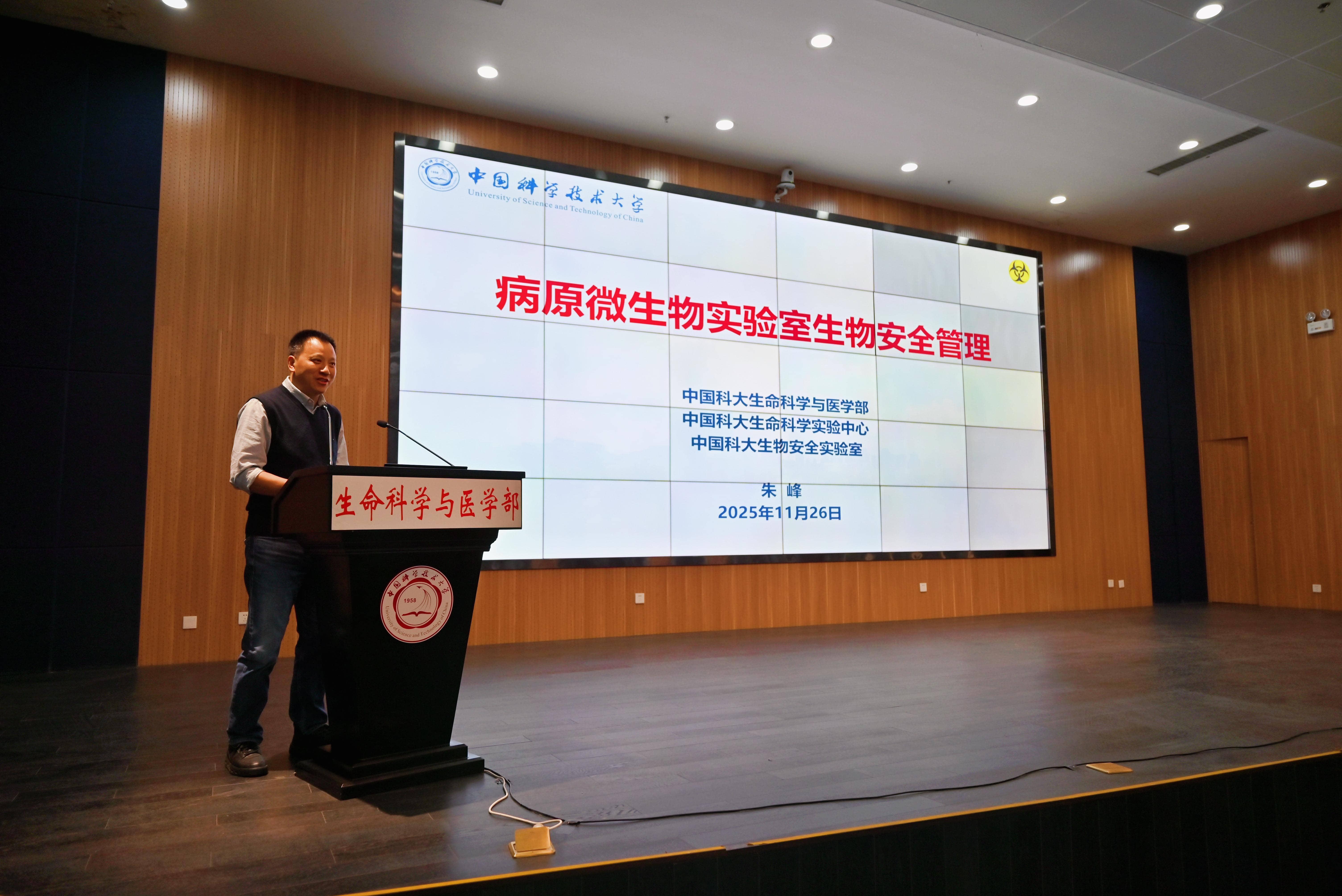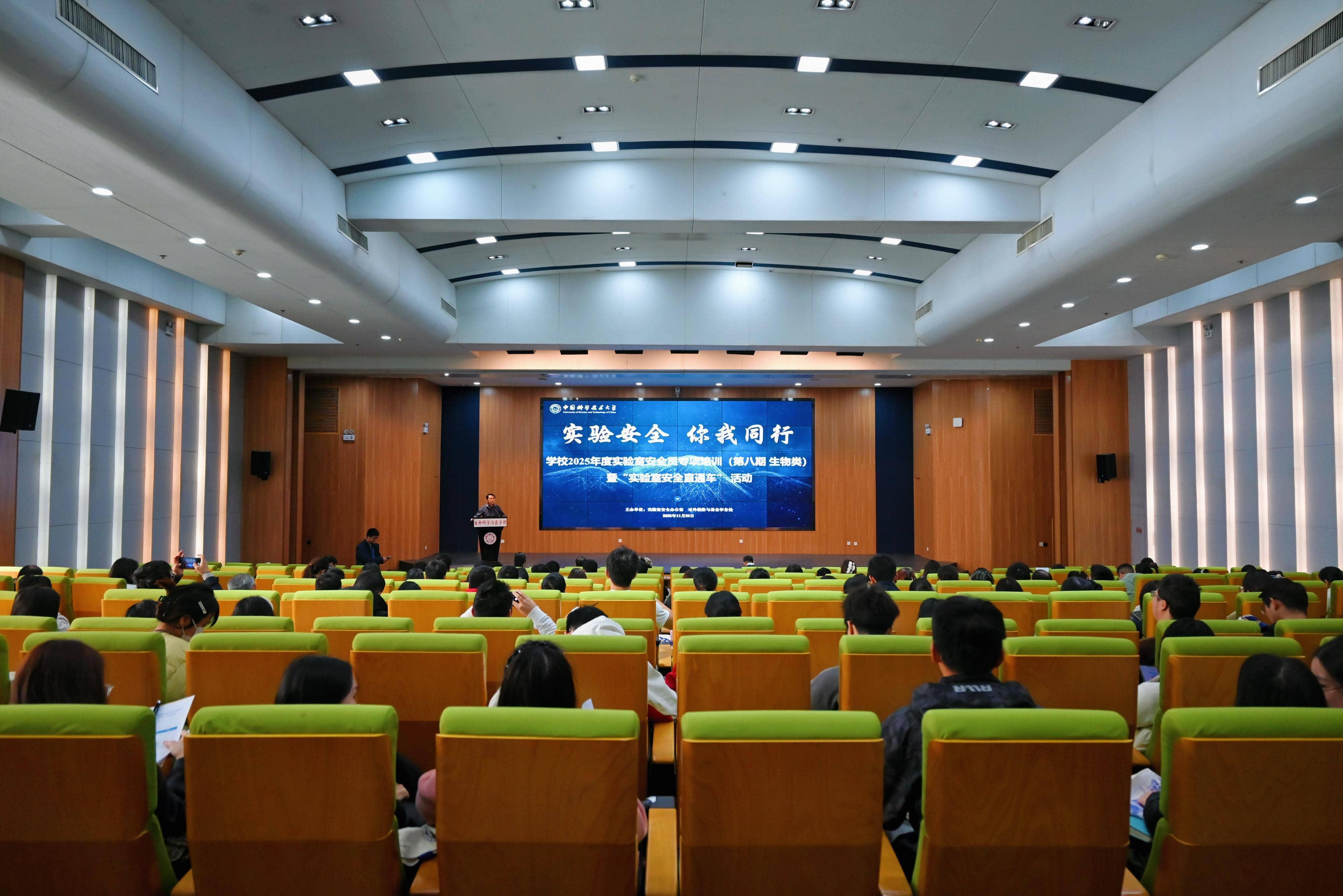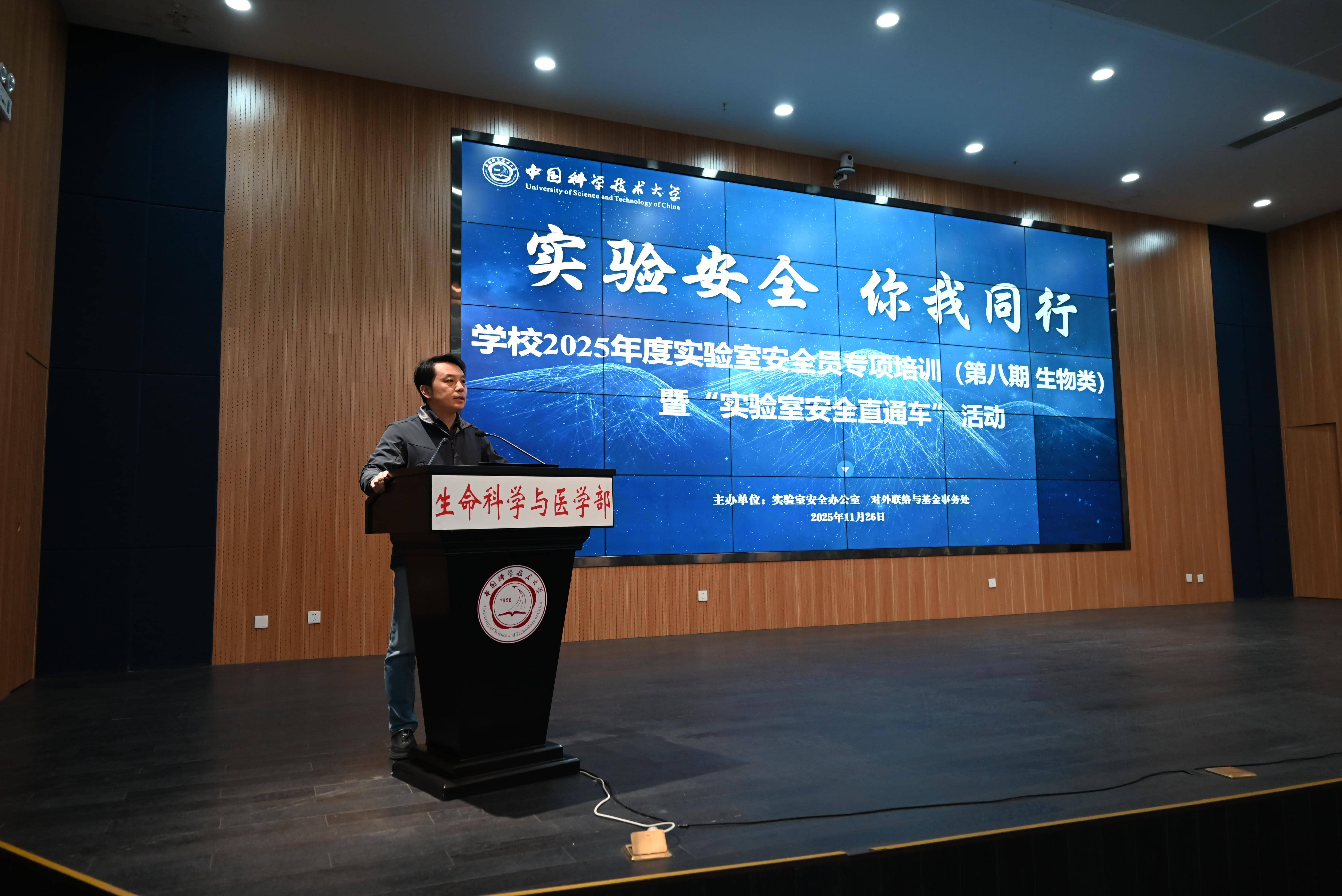 为深入贯彻落实《中华人民共和国生物安全法》等有关要求,进一步提升实验室生物安全管理水平与风险防控能力,11月26日,实验室安全办公室在生命科学大楼一楼报告厅组织开展2025年度实验室安全员专项培训(第八期 生物类)暨“实验室安全直通车”活动。生命科学与医学部、化学与材料科学学院、火灾安全全国重点实验室、物理学院、信息科学技术学院等二级单位院级安全员、实验室安全员代表等160余人参加会议,实验室安全办公室主任赵钢主持会议。